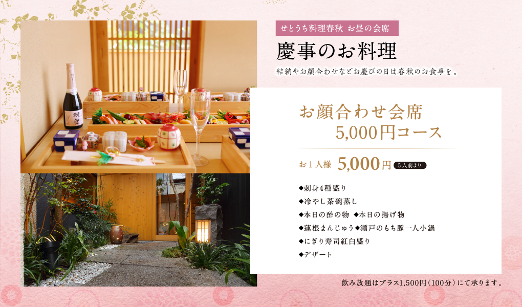 コース料理、宴会予約のキャンセルは5日前にお願いいたします。(お電話11:00〜22:30まで受付)