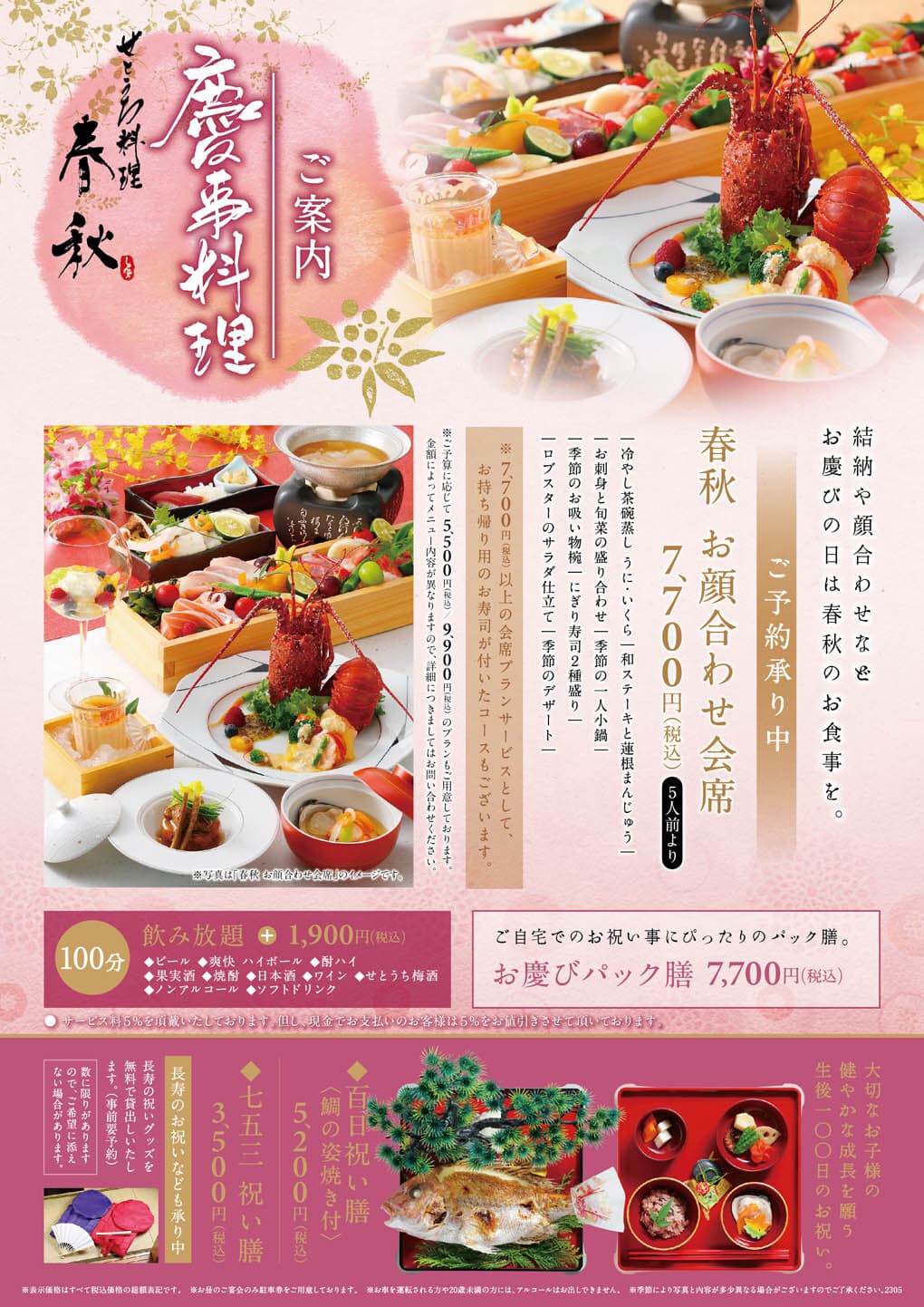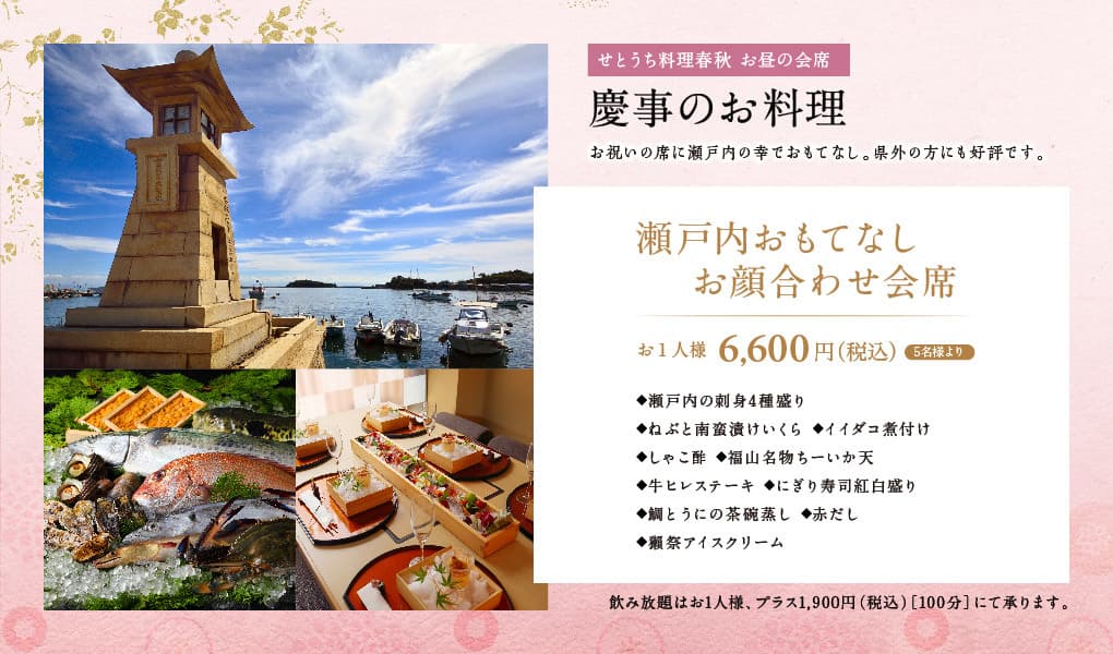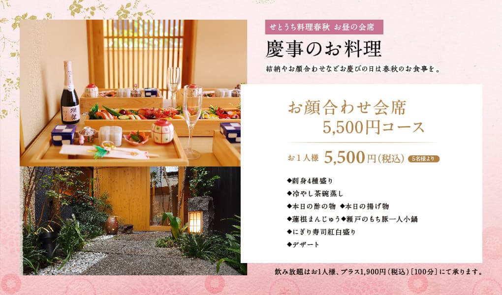 ご結納、お子様のお祝い・長寿のお祝いの席などに、特別なお料理を心ゆくまでご堪能ください。